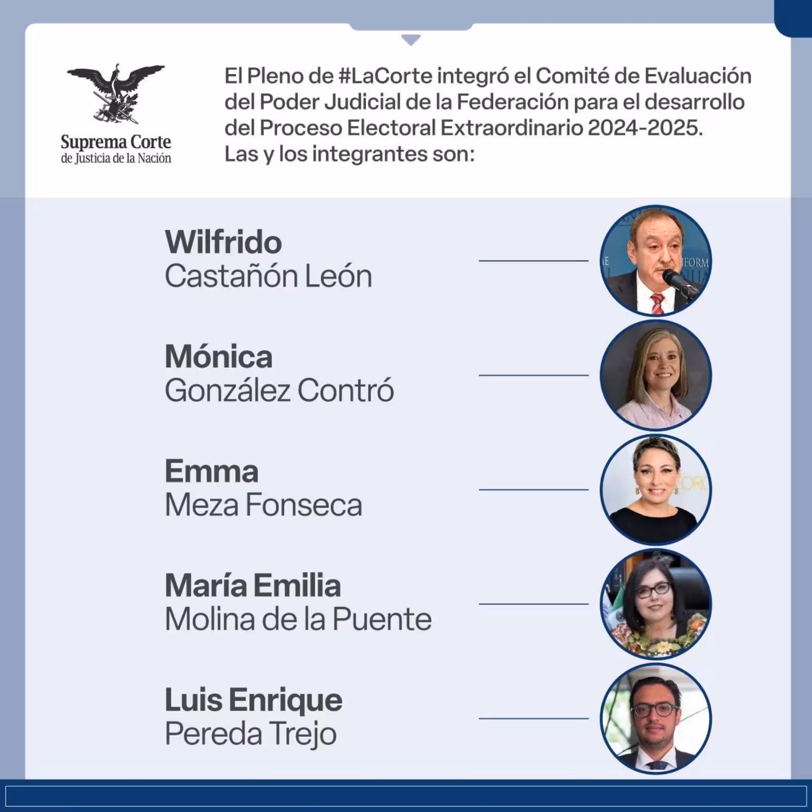 El comité está compuesto por cinco expertos en derecho, seleccionados cuidadosamente para representar una visión amplia y equilibrada del sistema judicial. Entre ellos se encuentran Mónica González Contró, actual directora del Instituto de Investigaciones Jurídicas de la Universidad Nacional Autónoma de México (UNAM), y Emma Meza Fonseca, magistrada del Noveno Tribunal Colegiado en Materia Penal del Primer Circuito. Ellas aportan una perspectiva académica y práctica clave y han defendido causas como los derechos humanos y la igualdad de género en sus respectivas trayectorias.